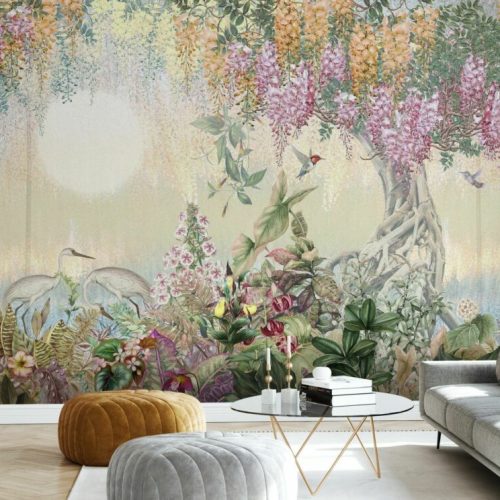 Tropikal Desenli Kuşlu Duvar Kağıdı