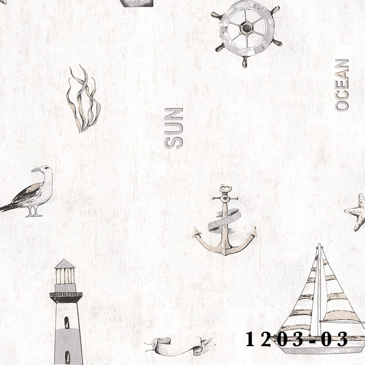 Çocuk odalarında eğlenceli, ferah ve tematik bir atmosfer oluşturmak isteyenler için tasarlanan Decowall Deco Junior 1203-03 duvar kağıdı, deniz konseptli figürleriyle dekorasyona hareket ve canlılık kazandırır. Yelkenli, çapa, dümen, deniz feneri ve martı gibi detaylarla zenginleştirilen bu özel tasarım, çocukların hayal gücünü desteklerken mekânda neşeli ve sıcak bir ambiyans oluşturur. Açık tonlu zemin rengi sayesinde odanın daha geniş ve aydınlık görünmesine yardımcı olur.
