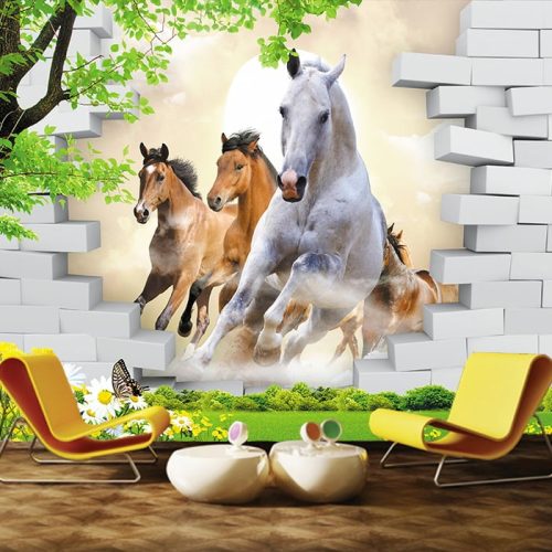Duvardan 3D Koşan Atlar Duvar Kağıdı