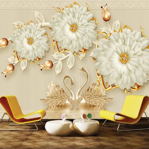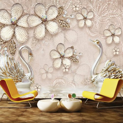 Lüx İnci Yapraklı Kuğulu Duvar Kağıdı
