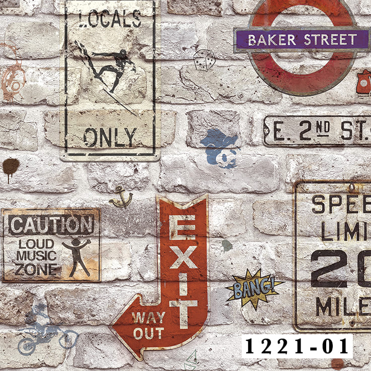 Gerçekçi tuğla dokusu ve retro şehir tabelalarıyla Decowall Deco Junior 1221-01 duvar kağıdı, mekânlara güçlü, modern ve enerjik bir dekoratif etki kazandırır.
