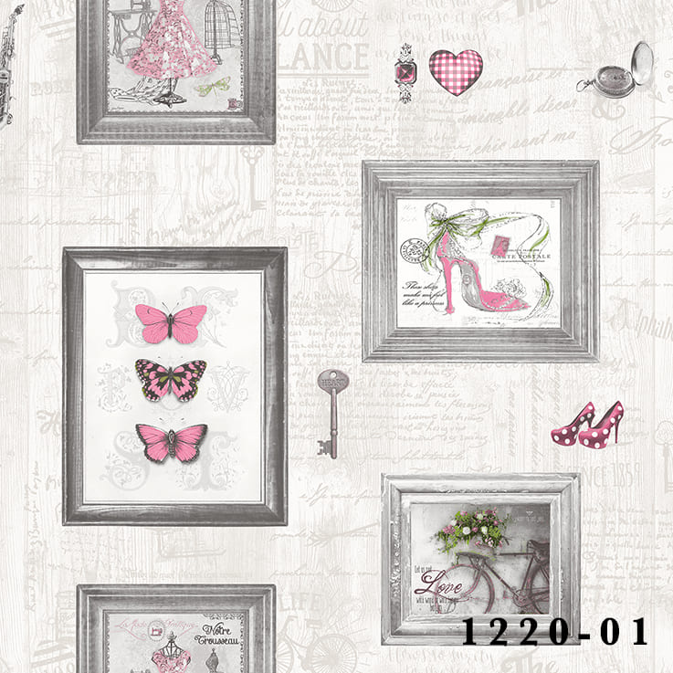 Romantik ve nostaljik dekorasyon tarzını yansıtan Decowall Deco Junior 1220-01 duvar kağıdı, vintage çerçeve tasarımları, zarif aksesuar figürleri ve pembe detaylarıyla mekânlara şık ve sıcak bir atmosfer kazandırır. Çerçeve içinde yer alan kelebek, ayakkabı, bisiklet ve moda temalı görseller dekorasyona sanatsal bir karakter katar.